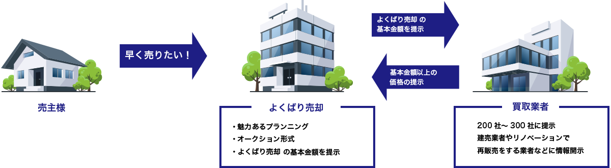 売りたい方へのプラン買取で売却を検討した家を買取よりも高く、そして、買取と同じように確実に売却できる、よくばり売却オリジナルのサービスです。 プロフィットシェアのメリット 一般的な買取とプロフィット・シェアの違い 一般的な買取…
