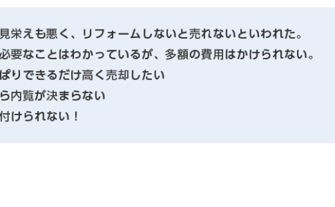 売りたい方へのプランこんなお悩みございませんか? おまかせR売却で解決できます! お客様のご負担は少なく、お家を綺麗にリフォームできます。さらに、より高い価格での売却の可能性がUP!お家が売れるまでにお客様が支払ったリフォームローンの返済は…